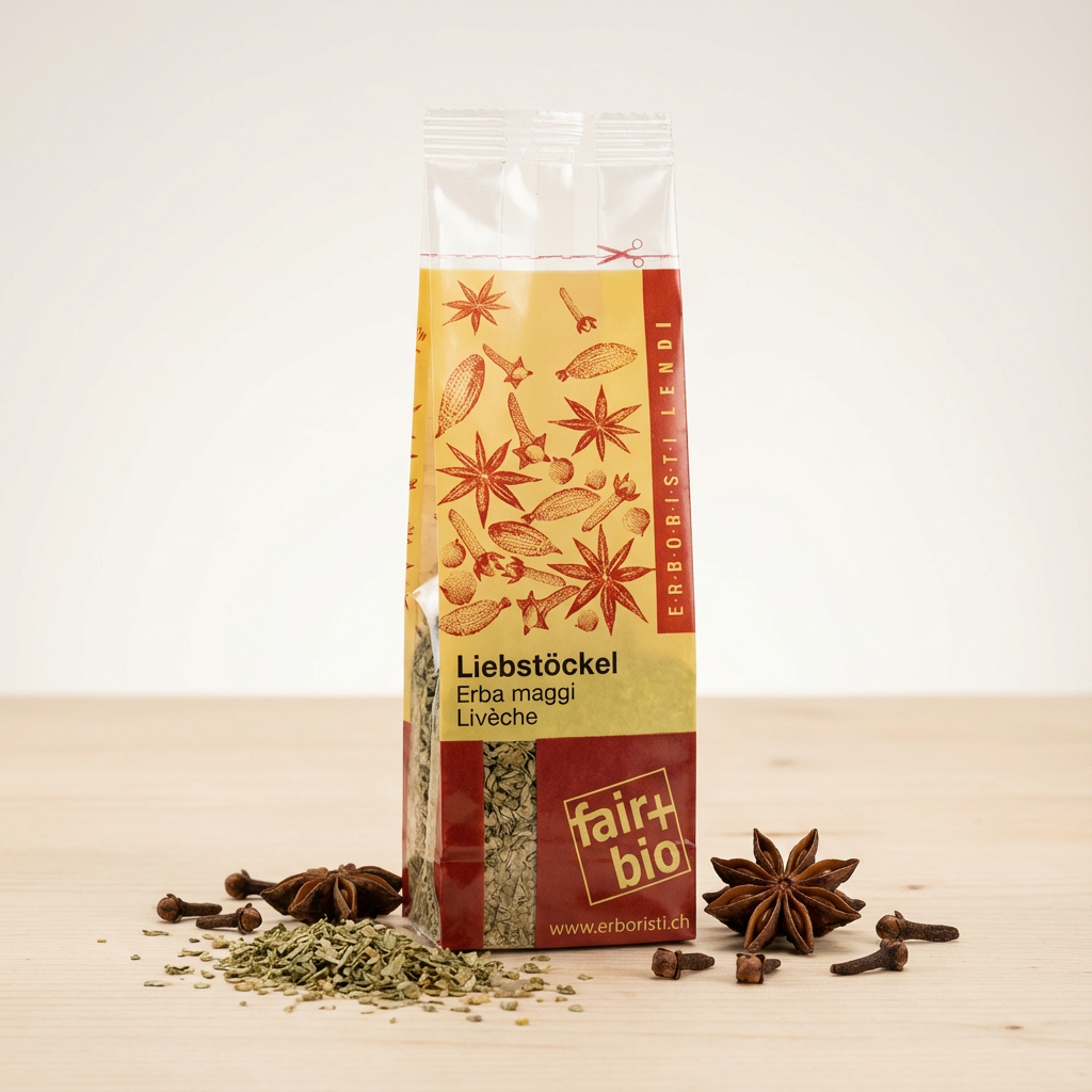 Liebstöckel, auch bekannt als Maggikraut, ist ein intensiv würziges Küchenkraut mit einem kräftigen, herzhaften Aroma. Es erinnert geschmacklich an Würzbrühe und verleiht Speisen eine salzige Note – ganz ohne Salz zu enthalten.